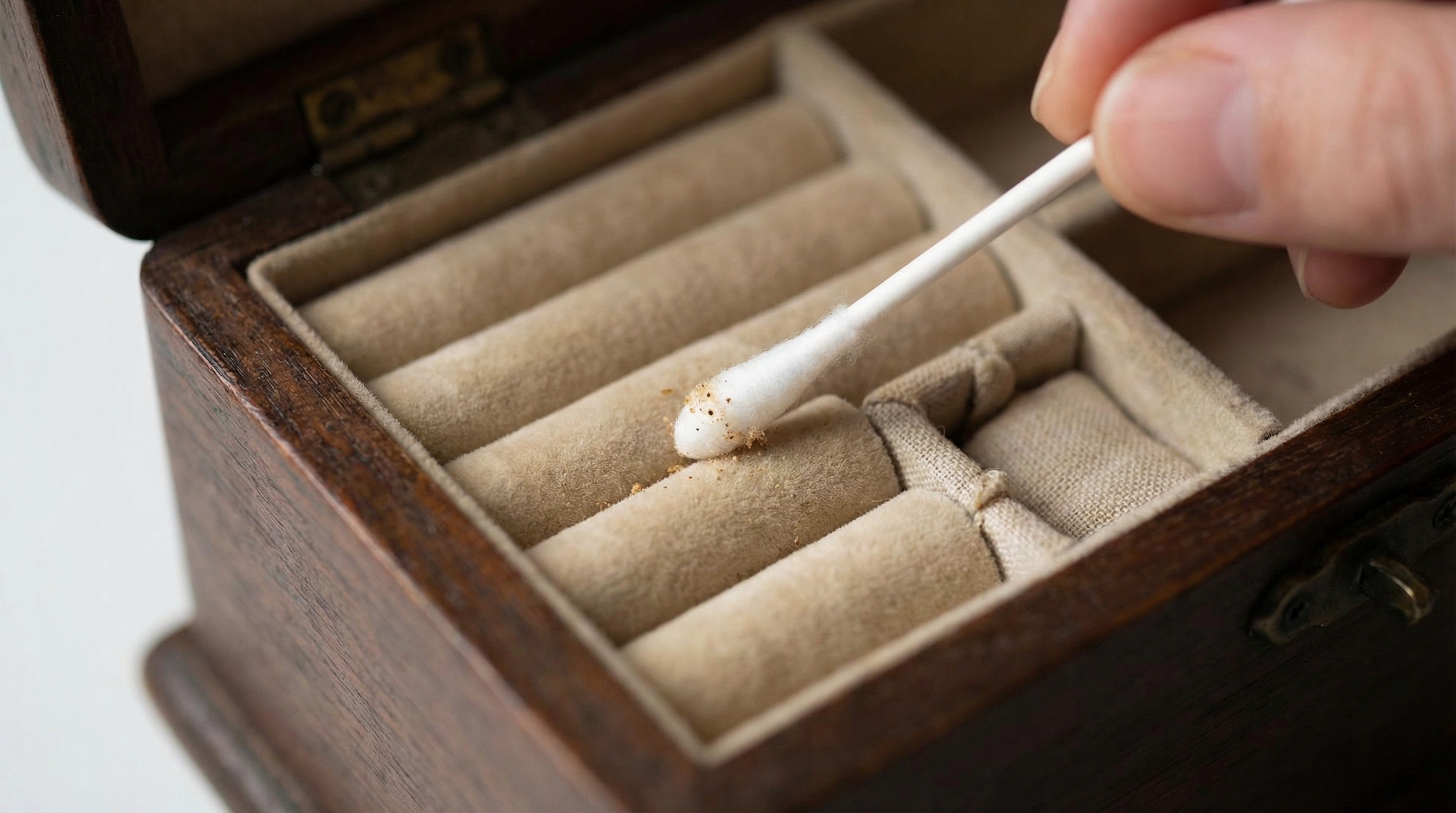 Precision tools like swabs allow for a professional-grade finish in the most difficult areas of a jewelry container.