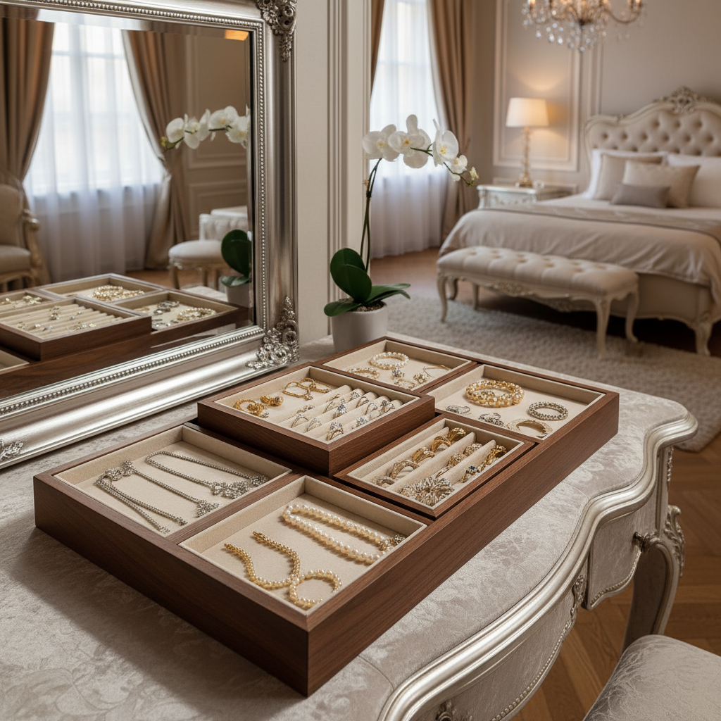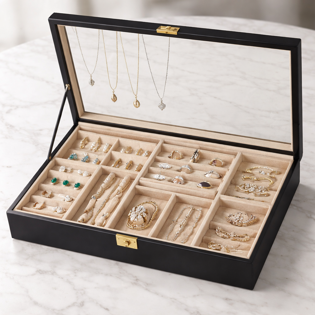 Modern jewelry display trends focus on transparency and minimalist aesthetics, such as glass-topped cases that allow you to view your collection without opening the lid. This “visible curation” approach turns your jewelry into a decor element.