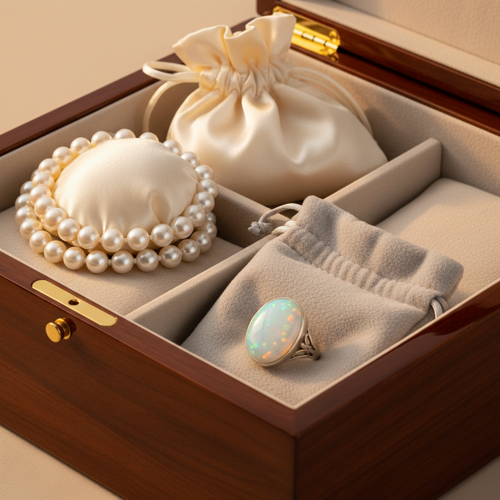 Using silk or cotton pouches provides the gentle environment pearls need while allowing for minimal air exchange to prevent dehydration. You should ensure that each strand or pair of earrings has its own individual pouch to prevent the hardware from scratching the pearl surfaces. This individual bagging also keeps strands from tangling or stretching the delicate silk thread they are often strung upon. Ready for the good part? Soft pouches also make your pearls feel even more like the rare, delicate treasures they are.