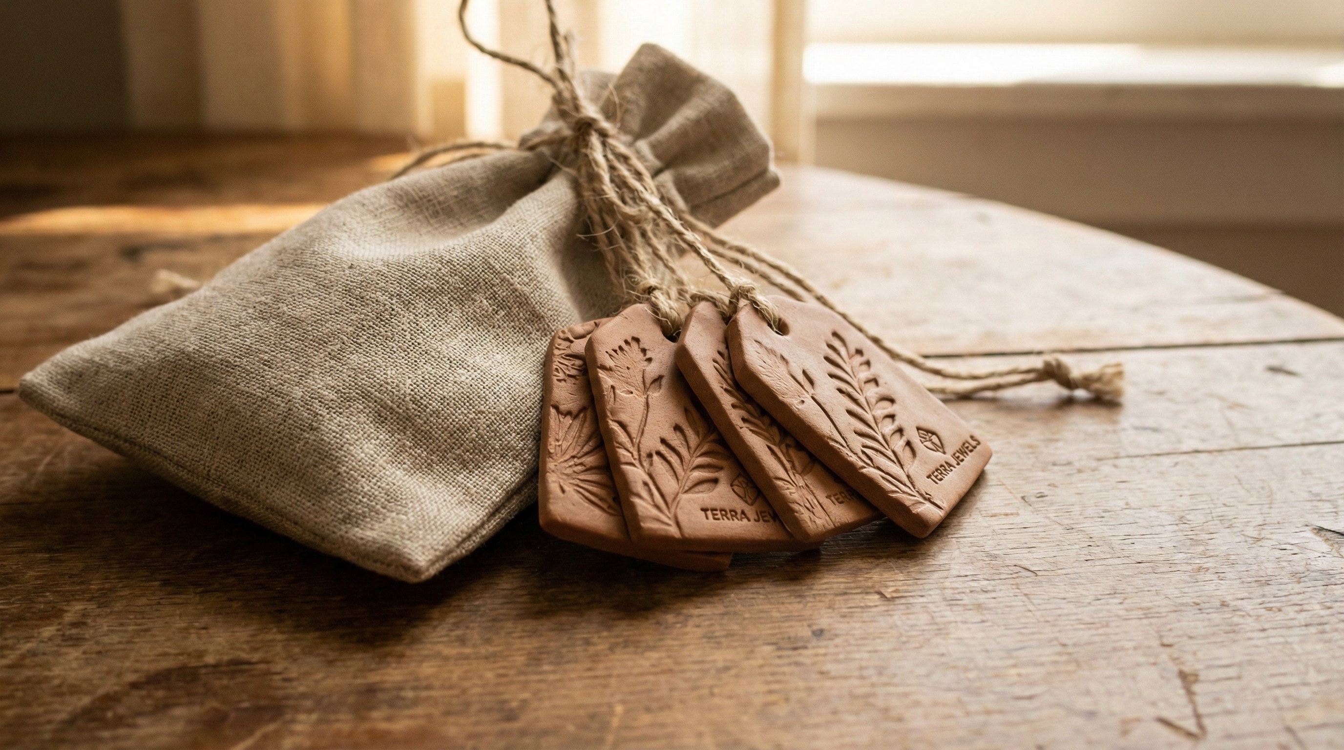 Linen and cotton diy jewelry packaging pouches are incredibly easy to put together and offer a tactile softness that customers love. You can elevate simple pouches by adding hand-pressed clay tags.