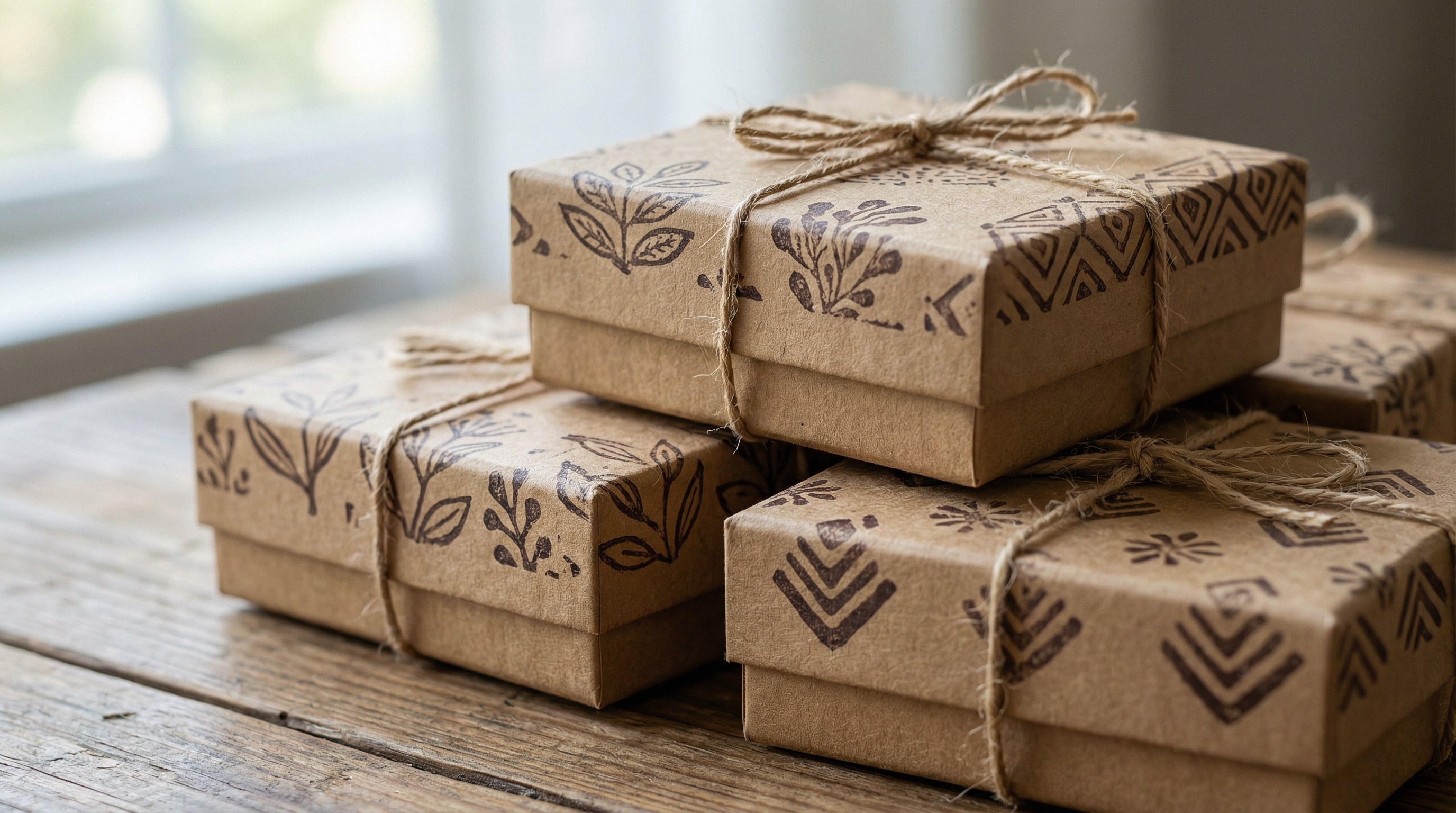 You can create a professional, artisanal look by using custom rubber stamps on plain kraft paper or cardboard. This method allows you to add your logo or seasonal patterns to jewelry boxes without the high cost of custom printing.