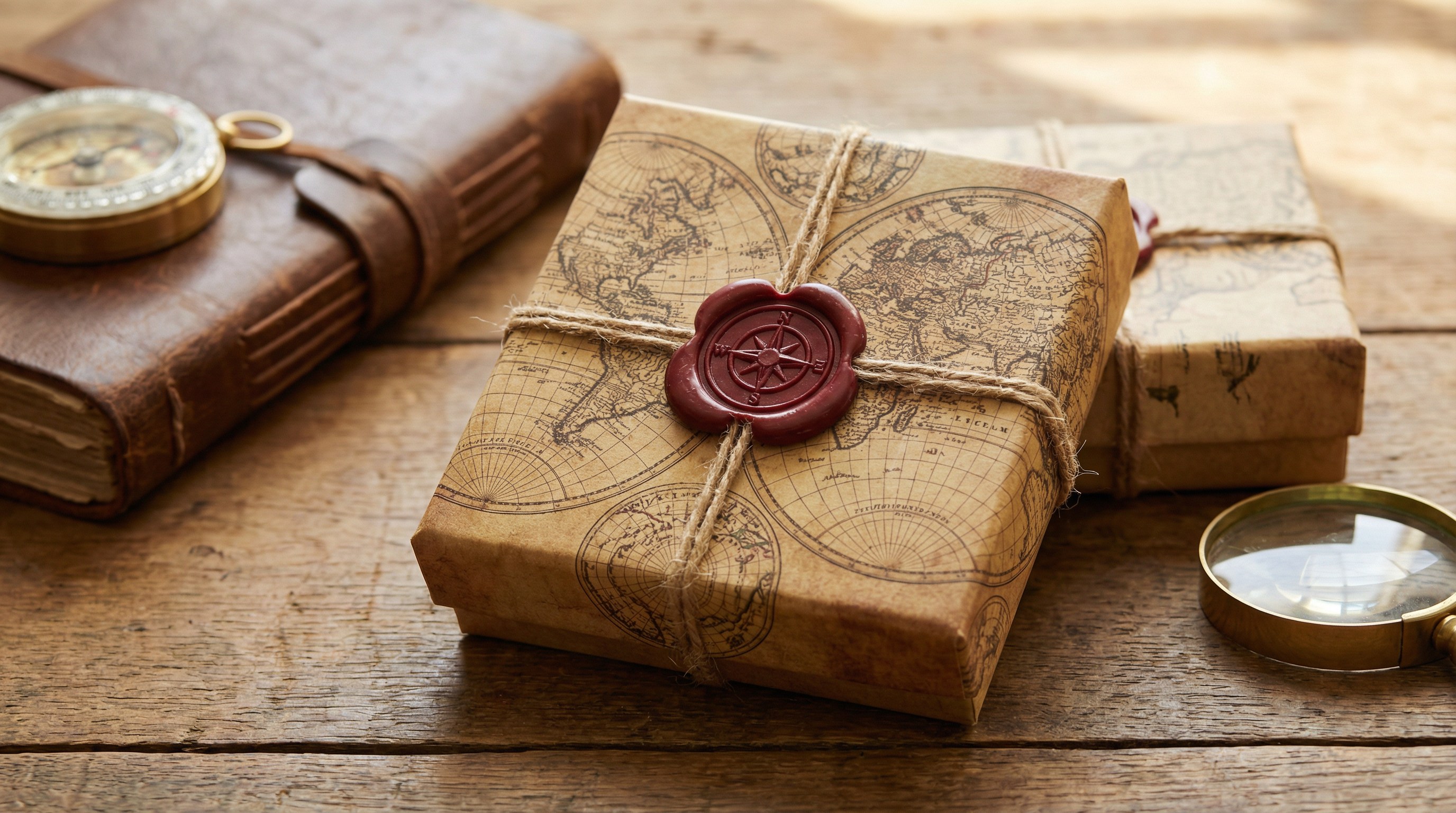 Here is the kicker. A deep red or gold wax seal on top of a map-wrapped box creates a truly regal “explorer” aesthetic.