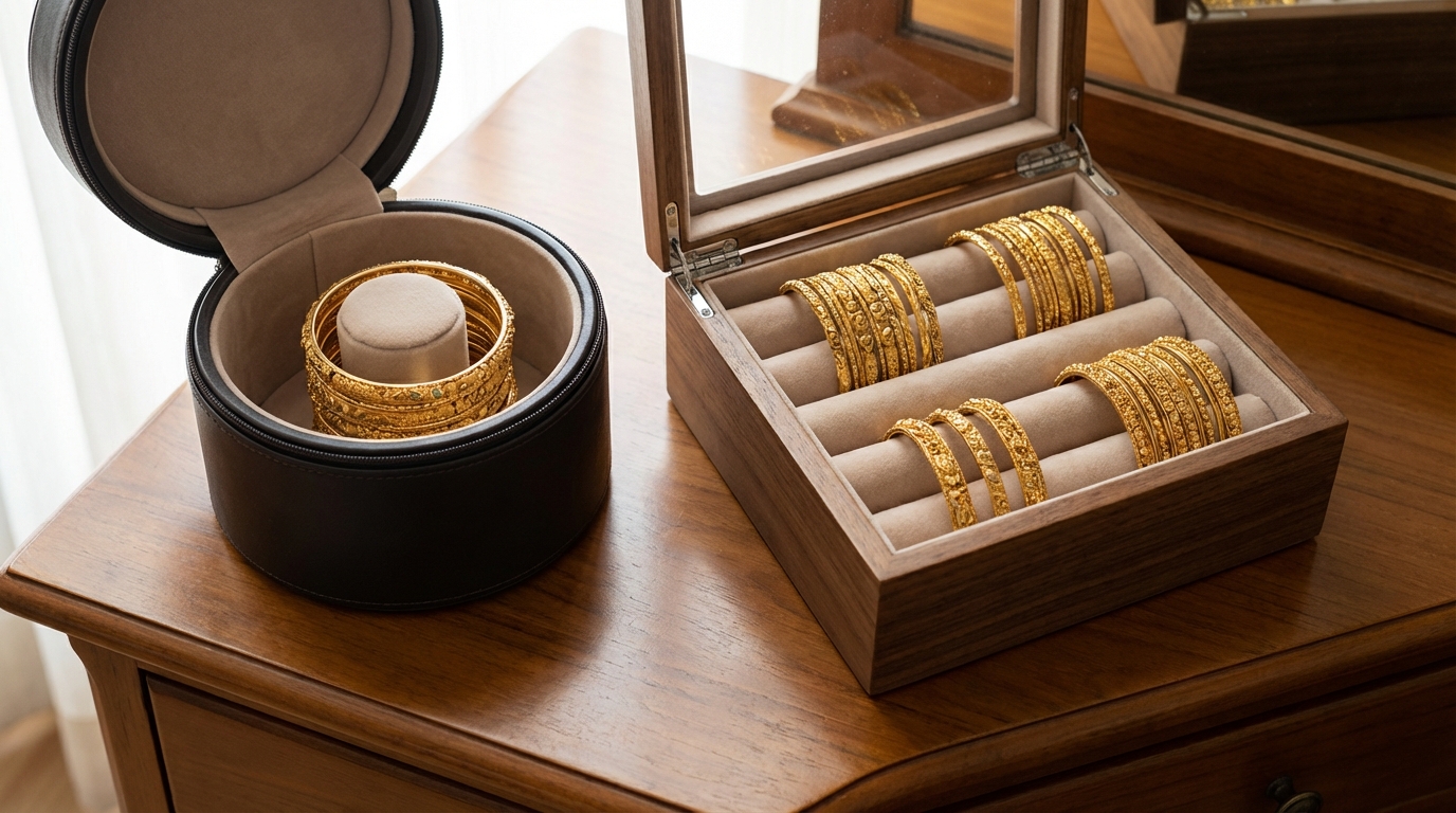 But there’s a catch: rolls can sometimes be cumbersome if you only want to access one specific piece. Square bangle boxes with individual compartments offer a “one-look” solution where every piece is visible at once. This is ideal for luxury collections where each bangle deserves its own spotlight.