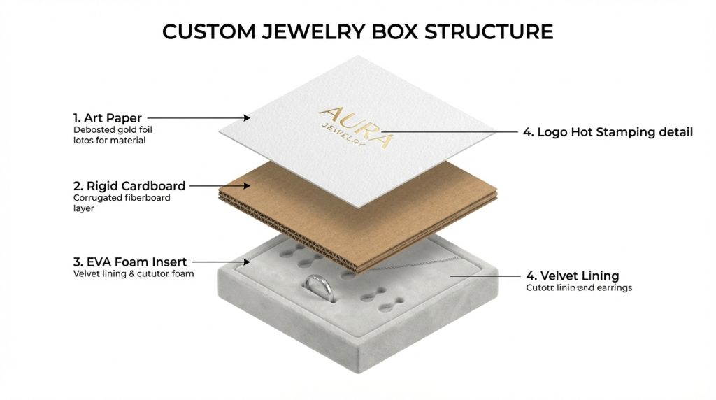 Understanding the internal structure of various jewelry boxes styles is key to making a smart investment for your brand. A high-quality custom box is a sandwich of multiple specialized materials, each performing a specific role. From the rigid core to the decorative finish, every layer must be chosen with care to ensure long-lasting performance.