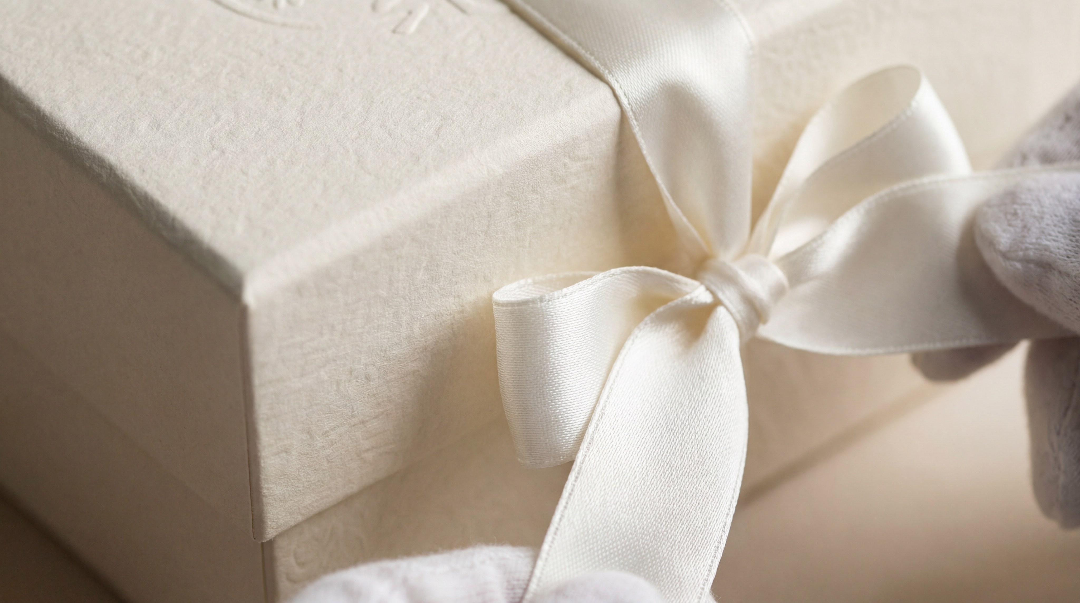 - Unboxing experience: The white ribbon creates a specific ritual of anticipation.