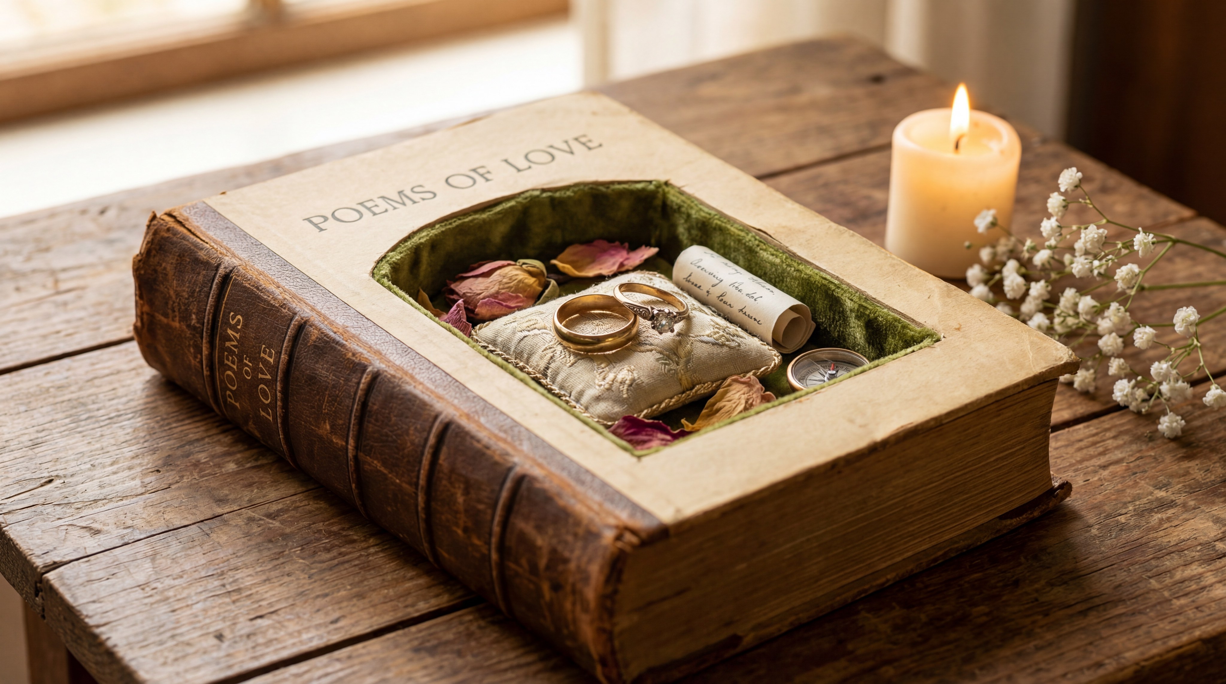 A hollowed-out vintage book is the best ring box for bookworms and fans of specific literary universes. You can personalize this experience by carving a niche into a meaningful chapter that tells your unique love story.