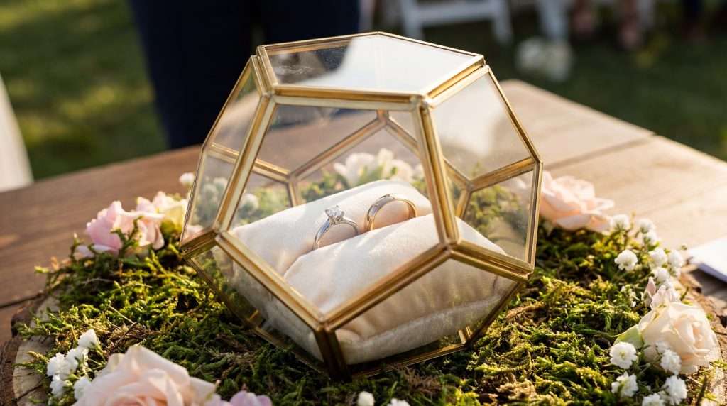 A glass conservatory vessel is the best ring box for stationary proposals where you want the jewelry to be visible before it is even touched. These boxes use leaded glass and metal edging to create a classic, museum-quality display for the ring.