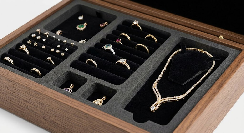 We have explored the essential steps for transforming chaotic storage into a professional, organized system. From selecting high-density foam to choosing the perfect velvet lining, you now have the knowledge to protect your most valuable assets. These strategies solve the common problems of tangled chains and scratched gems while significantly enhancing your brand’s presentation.