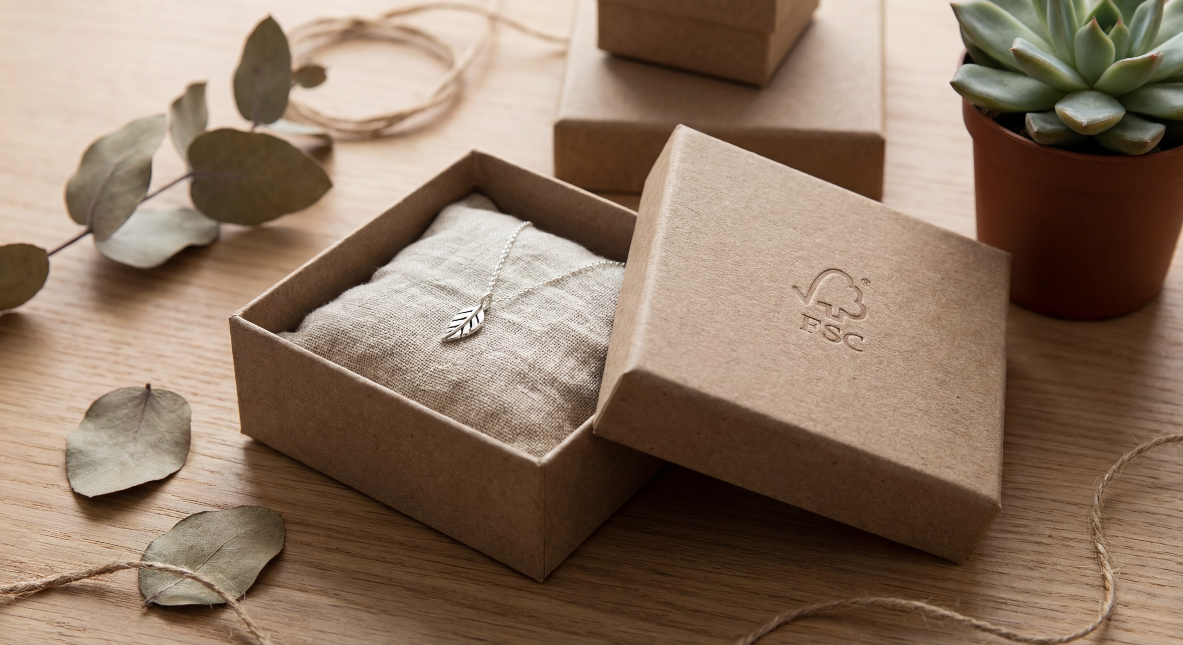 Molded pulp is made from recycled paper and can be pressed into precise shapes for rings and necklaces. It is exceptionally durable and can be dyed with soy-based inks to match any brand palette while being 100% compostable.