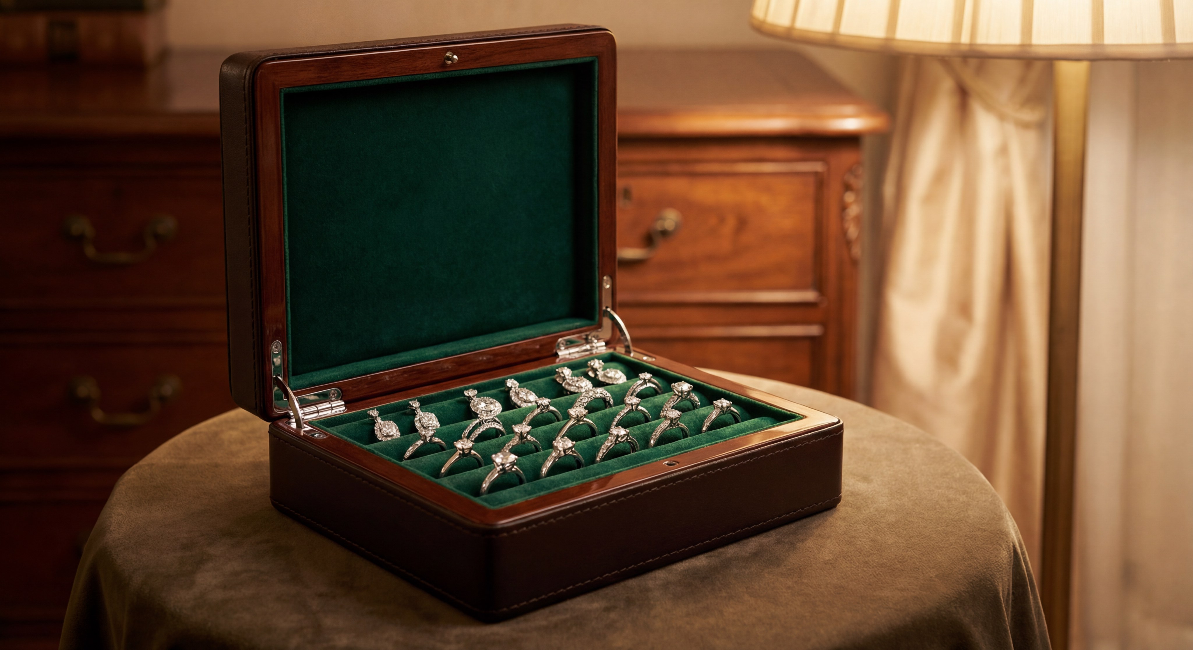 Contrast isn’t just aesthetic; it’s functional. A white gold ring on a white silk insert disappears, whereas the same ring on a deep emerald or charcoal velvet insert appears larger and more brilliant.
