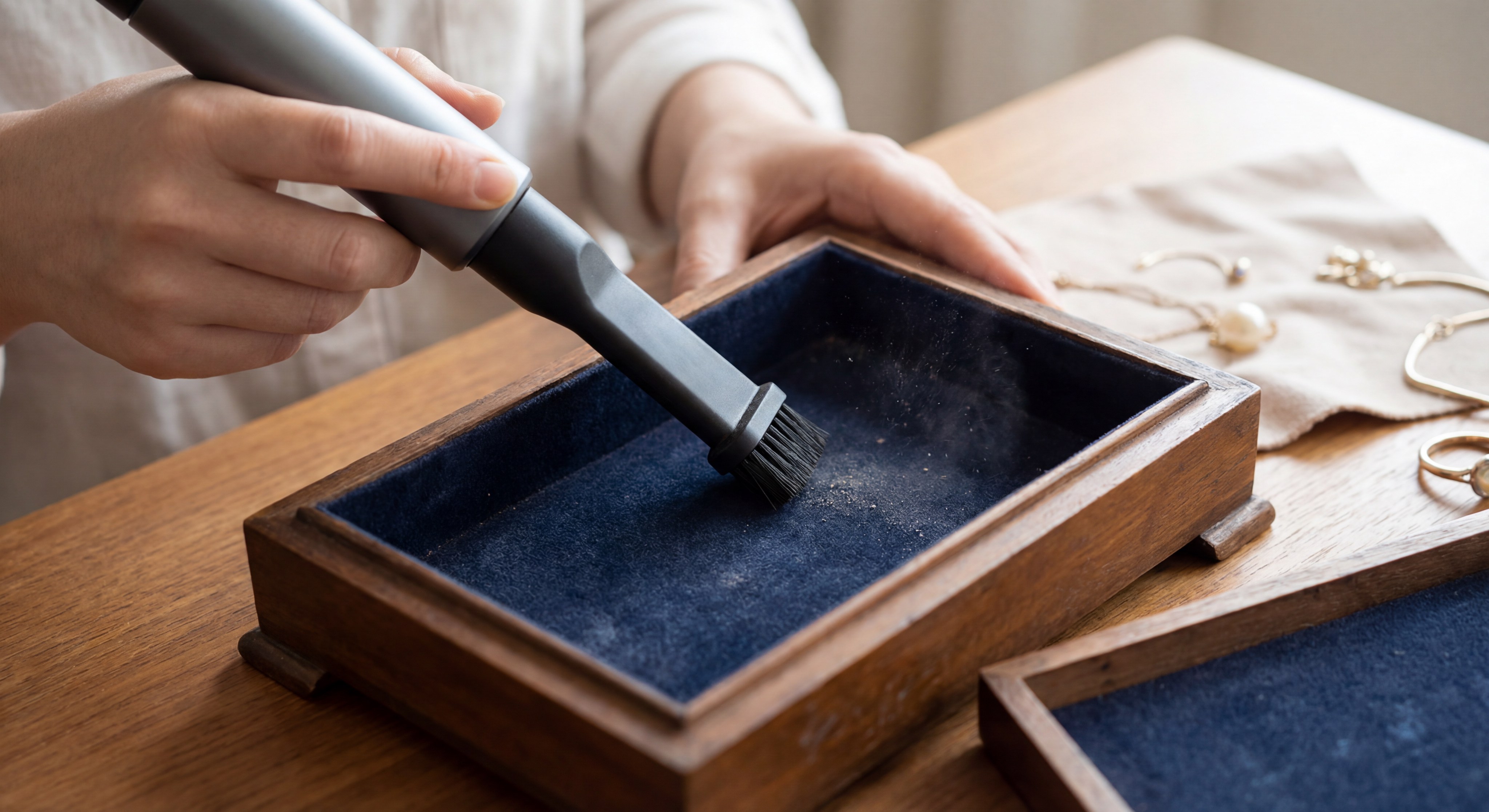 The best tools for this task include soft-bristled makeup brushes, low-suction vacuums, and lint-free microfiber cloths. Selecting the right instruments is the foundation of how to clean a jewelry box without introducing new contaminants to the textile. Using specialized equipment for your necklace box ensures that every corner remains debris-free.