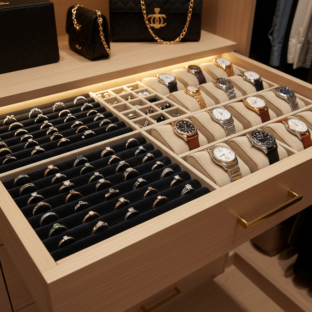 What’s the best material for a closet jewelry box lining?Premium velvet or high-density micro-suede is ideal for protecting your delicate gemstones and metal finishes. These materials provide a soft, non-slip surface that prevents scratching during movement.