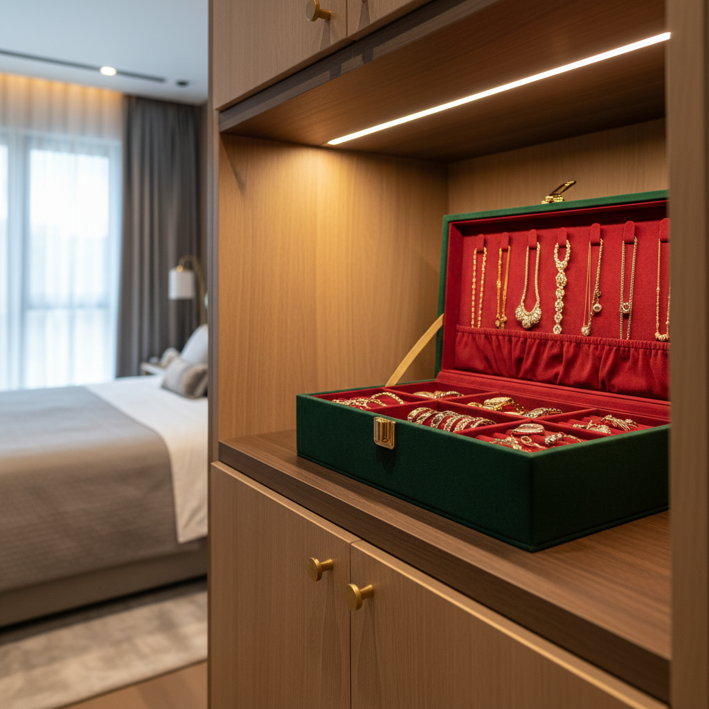 Strategic lighting significantly influences the functionality of your storage spot and your ability to coordinate outfits. You will find that deciding where to put jewelry box in bedroom closets is easier when you prioritize well-lit zones. Motion-activated LED strips illuminate your treasures the moment you open the door or enter the nook. Proper light levels enhance the sparkle of gemstones and help you distinguish between silver and gold finishes.