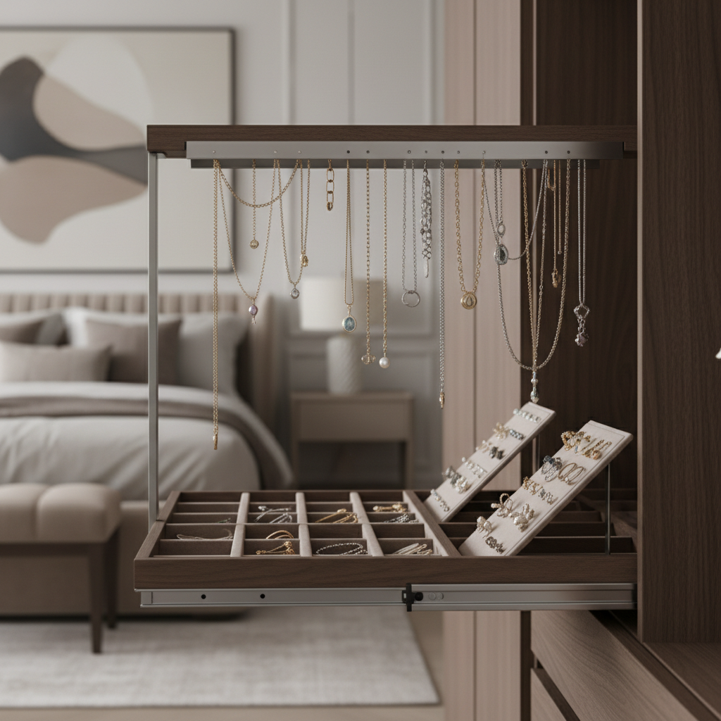 Key Takeaway: Drawer-based storage offers a sleek, hidden solution that protects jewelry from environmental damage.